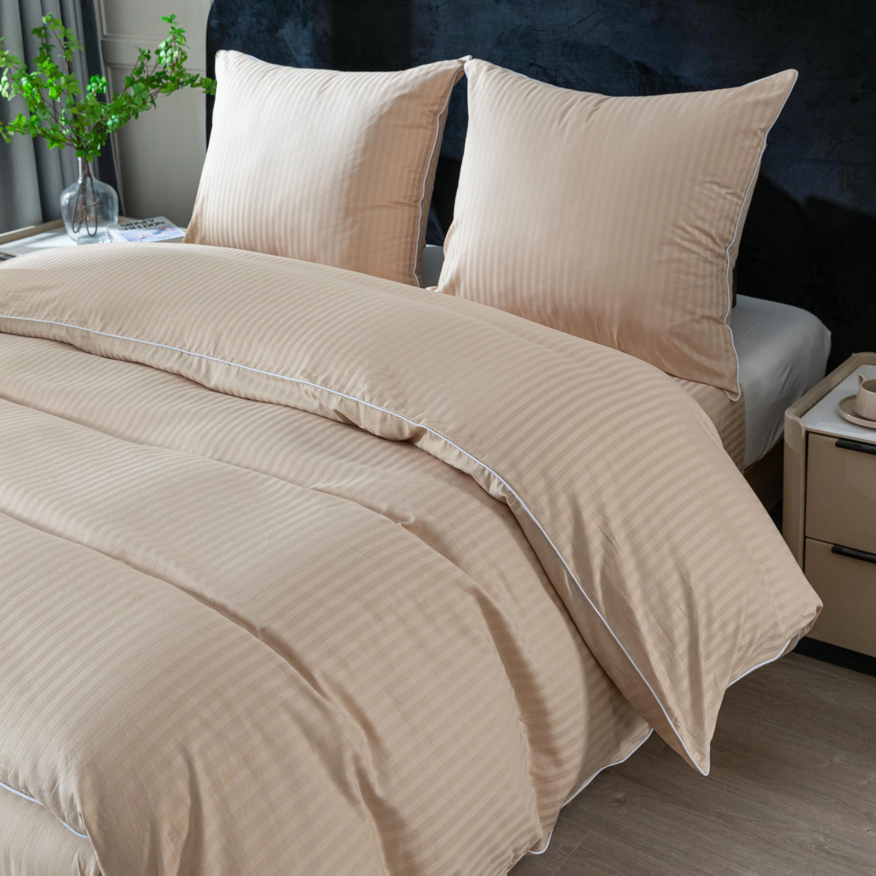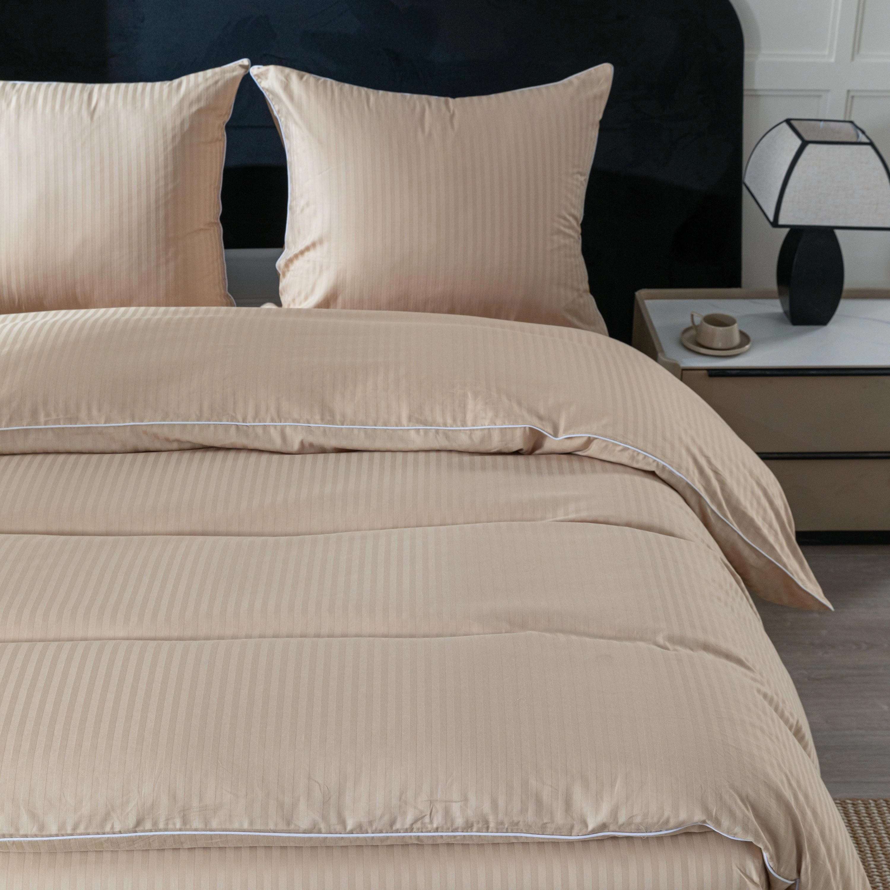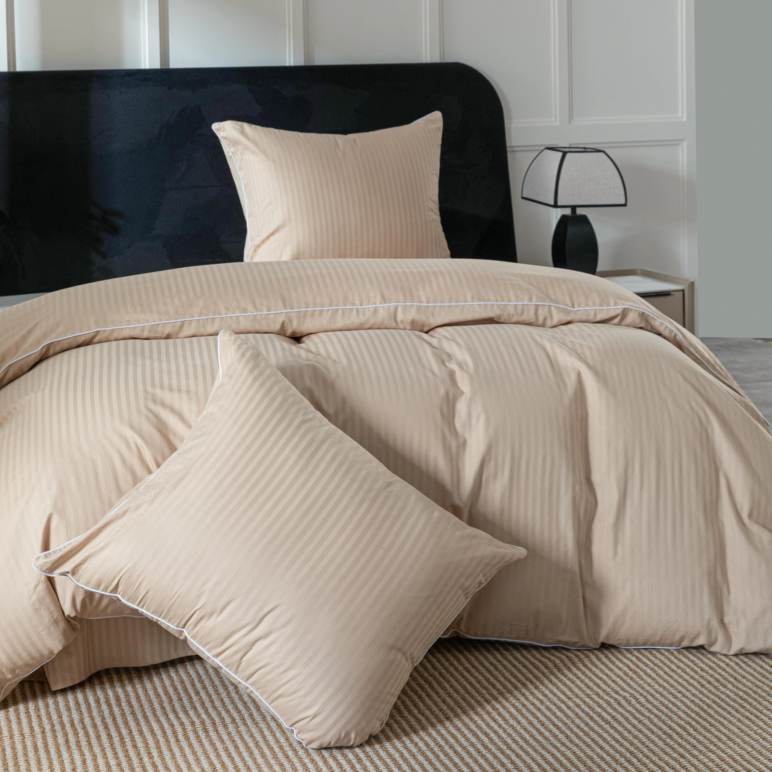 Styl hotelowy, który wprowadza do sypialni porządek, elegancję i ponadczasowy wygląd. Pościel wykonana w 100% z wysokiej jakości bawełny zachwyca subtelnym wzorem w pasy oraz dekoracyjną lamówką, która nadaje jej ekskluzywnego charakteru.