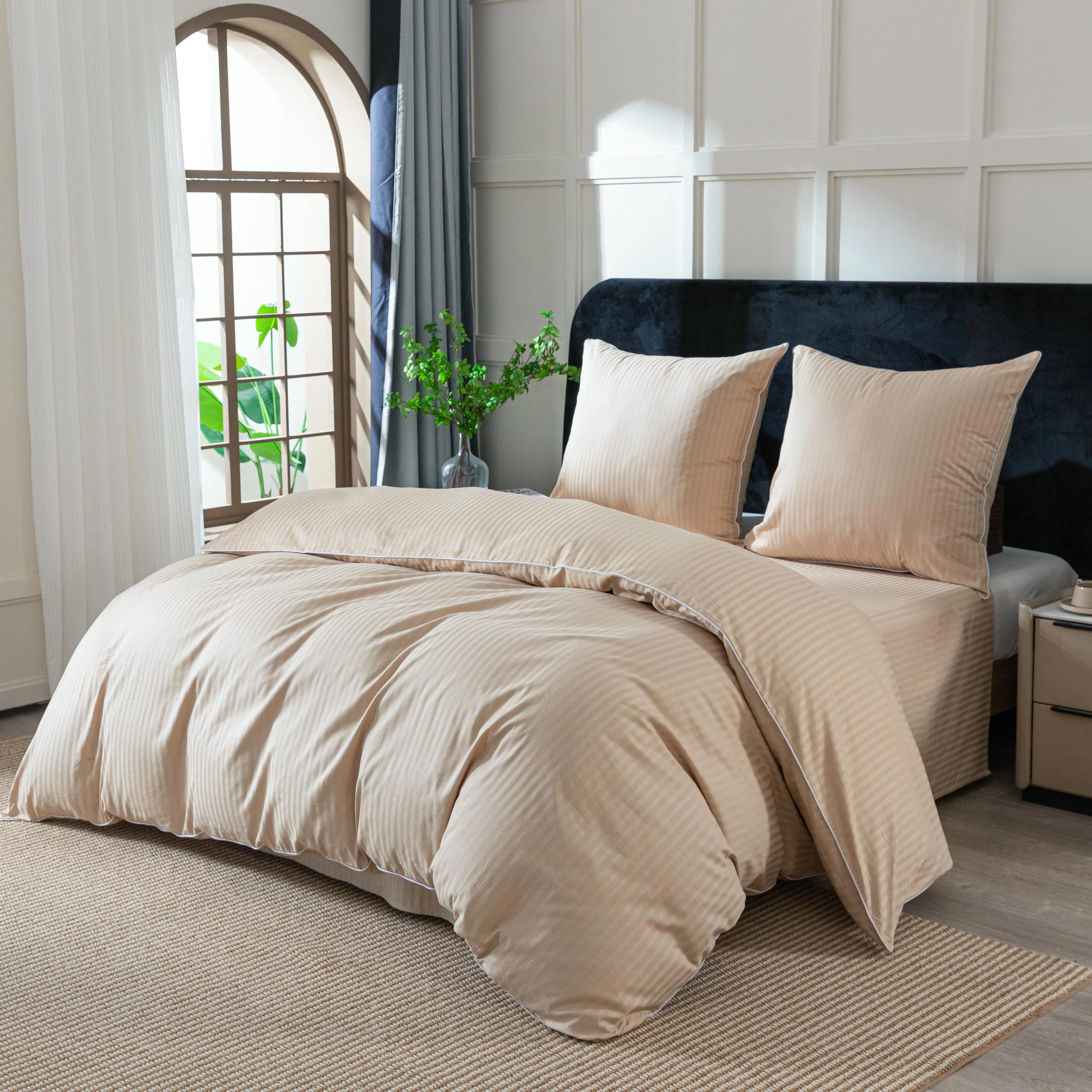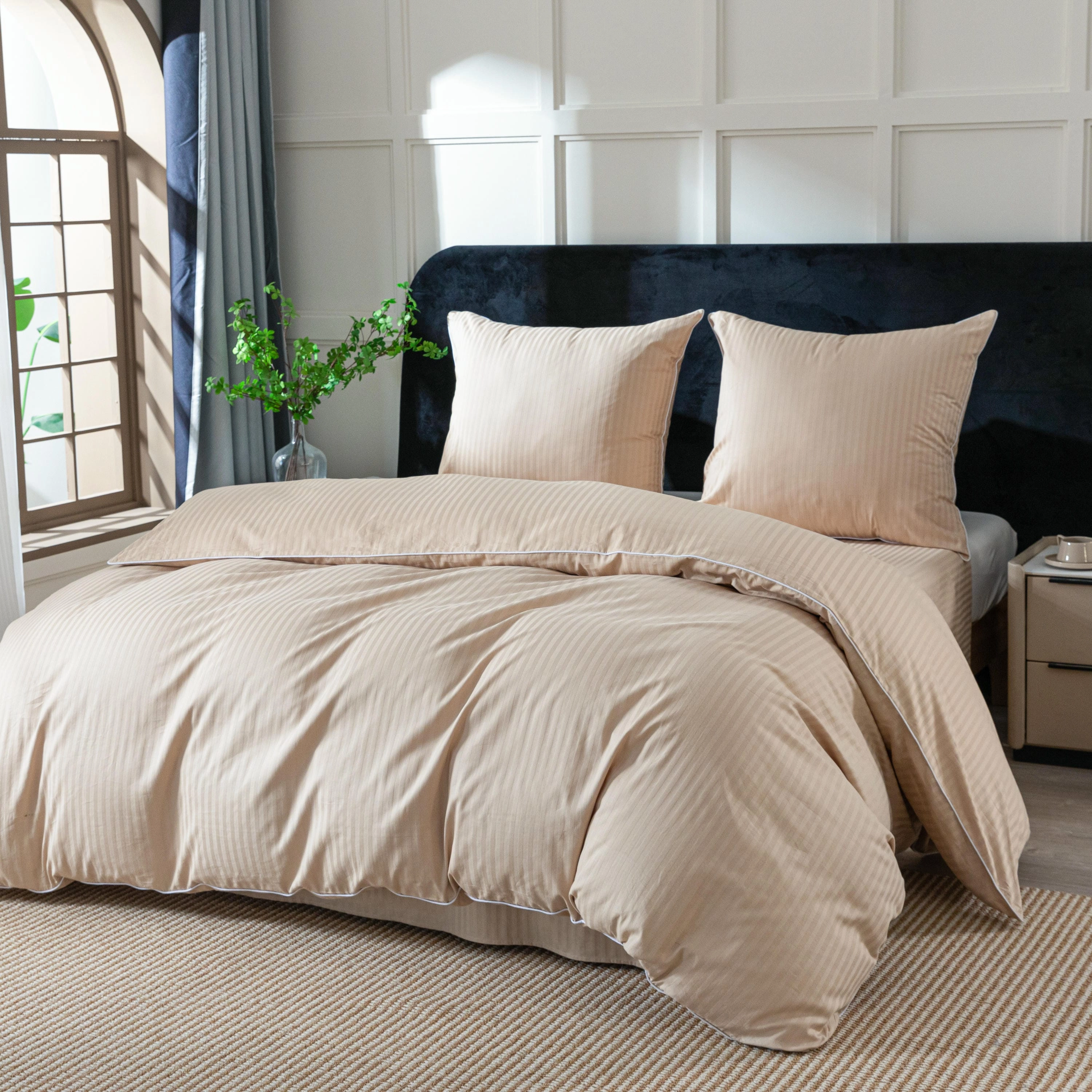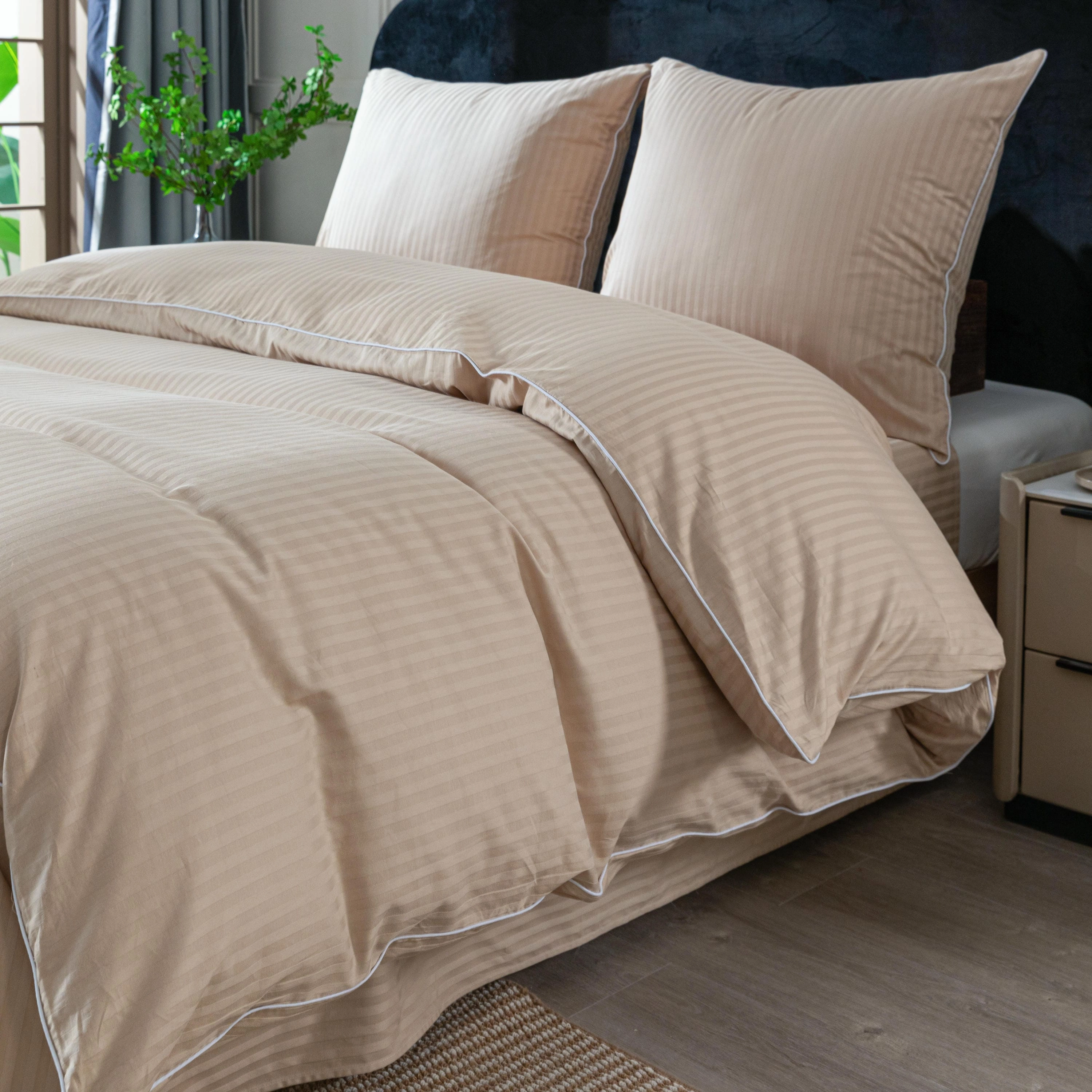 Styl hotelowy, który wprowadza do sypialni porządek, elegancję i ponadczasowy wygląd. Pościel wykonana w 100% z wysokiej jakości bawełny zachwyca subtelnym wzorem w pasy oraz dekoracyjną lamówką, która nadaje jej ekskluzywnego charakteru.