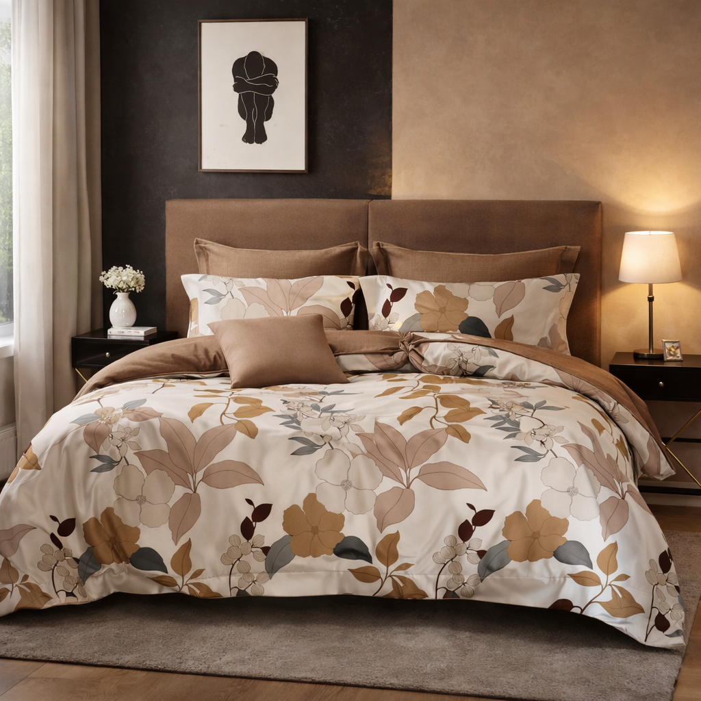 Beżowa dwustronna pościel w kwiaty 200x220 z prześcieradłem