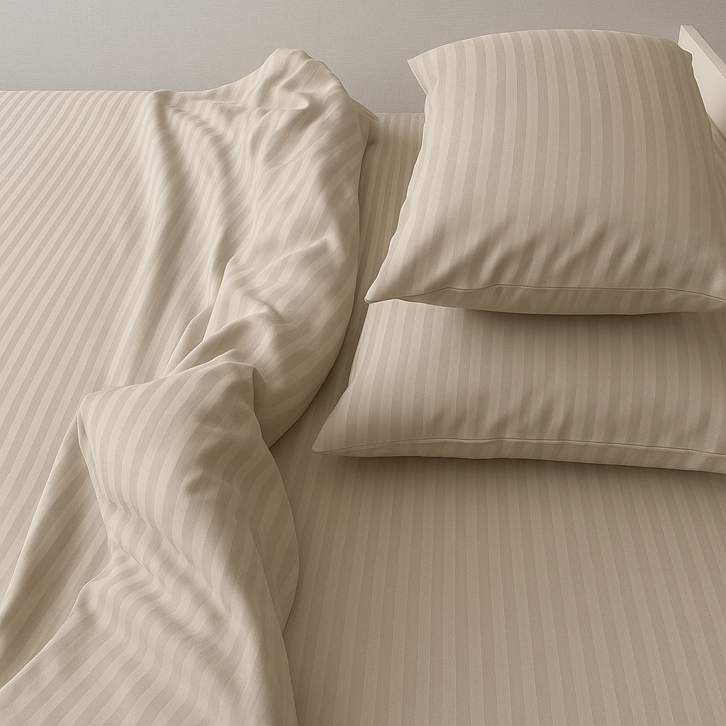 Przedstawiamy naszą hotelową pościel w odcieniach beżu, ozdobioną eleganckimi paskami, która przeniesie komfort i wytworność hotelowej sypialni prosto do Twojego domu. Nasza pościel to gwarancja wyjątkowego komfortu i stylu.