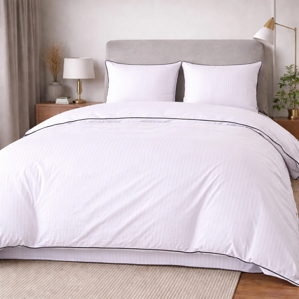 Styl hotelowy, który wprowadza do sypialni porządek, elegancję i ponadczasowy wygląd. Pościel wykonana w 100% z wysokiej jakości bawełny zachwyca subtelnym wzorem w pasy oraz dekoracyjną lamówką, która nadaje jej ekskluzywnego charakteru.