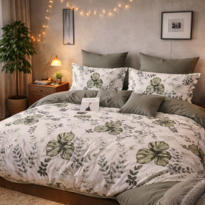 Jeśli szukasz eleganckiej, naturalnej i ponadczasowej pościeli 160x200 z satyny bawełnianej, ten komplet będzie idealnym wyborem. Jasne, kremowo-beżowe tło połączone z subtelnym, roślinnym wzorem w odcieniach szałwiowej zieleni i oliwki tworzy harmonijną, spokojną kompozycję.