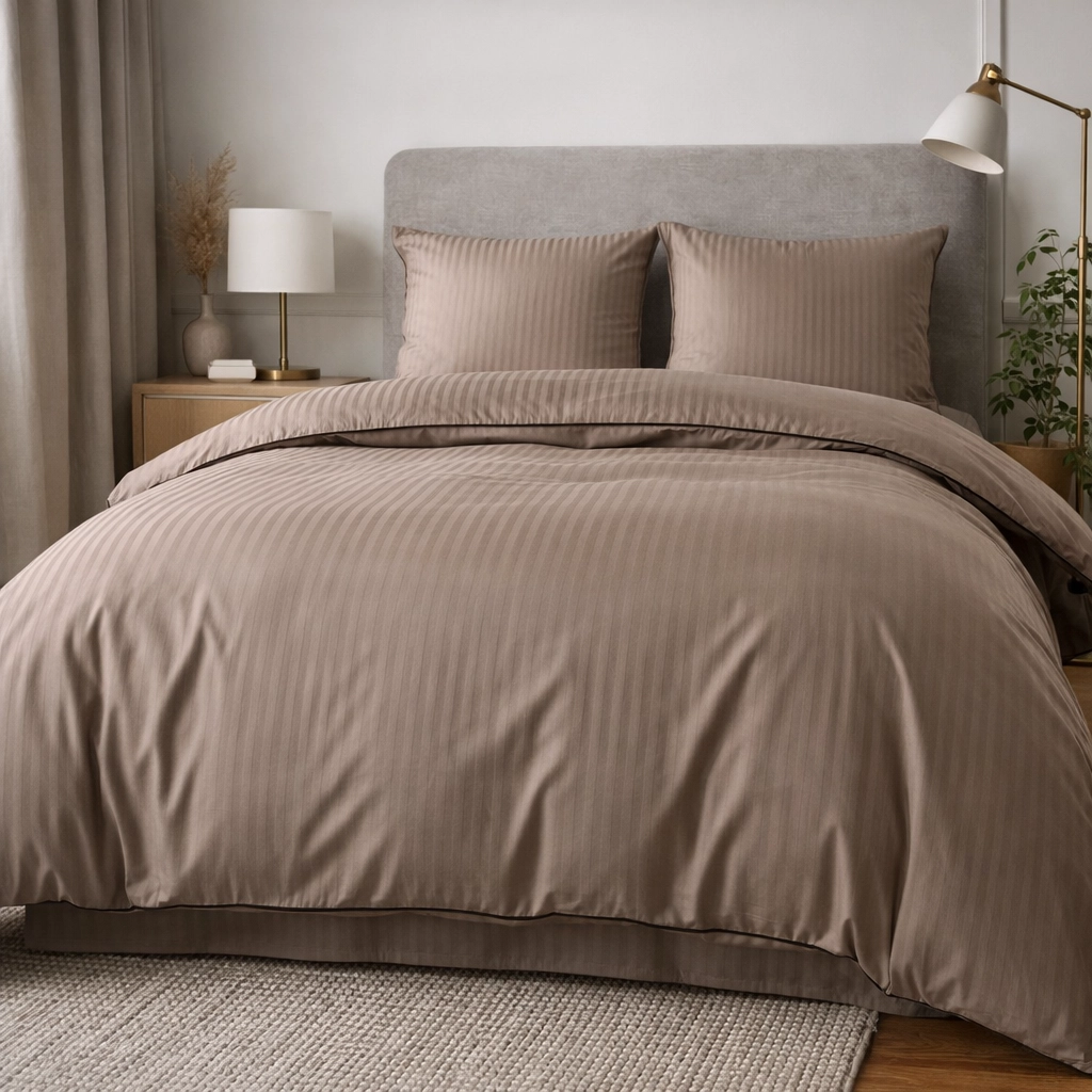 Styl hotelowy, który wprowadza do sypialni porządek, elegancję i ponadczasowy wygląd. Pościel wykonana w 100% z wysokiej jakości bawełny zachwyca subtelnym wzorem w pasy oraz dekoracyjną lamówką, która nadaje jej ekskluzywnego charakteru.