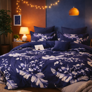 Pościel z satyny bawełnianej 200×220 w głębokiej granatowej kolorystyce z eleganckim, jasnym motywem roślinnym to propozycja dla osób ceniących wyrazisty styl i elegancję. Gładka, oddychająca satyna bawełniana zapewnia wysoki komfort snu oraz estetyczny wygląd przez długi czas. Idealna do wnętrz nowoczesnych, eleganckich i hotelowych.
